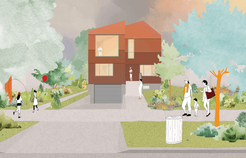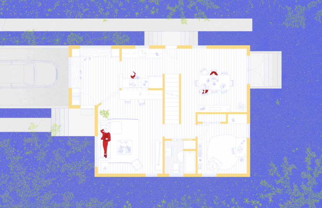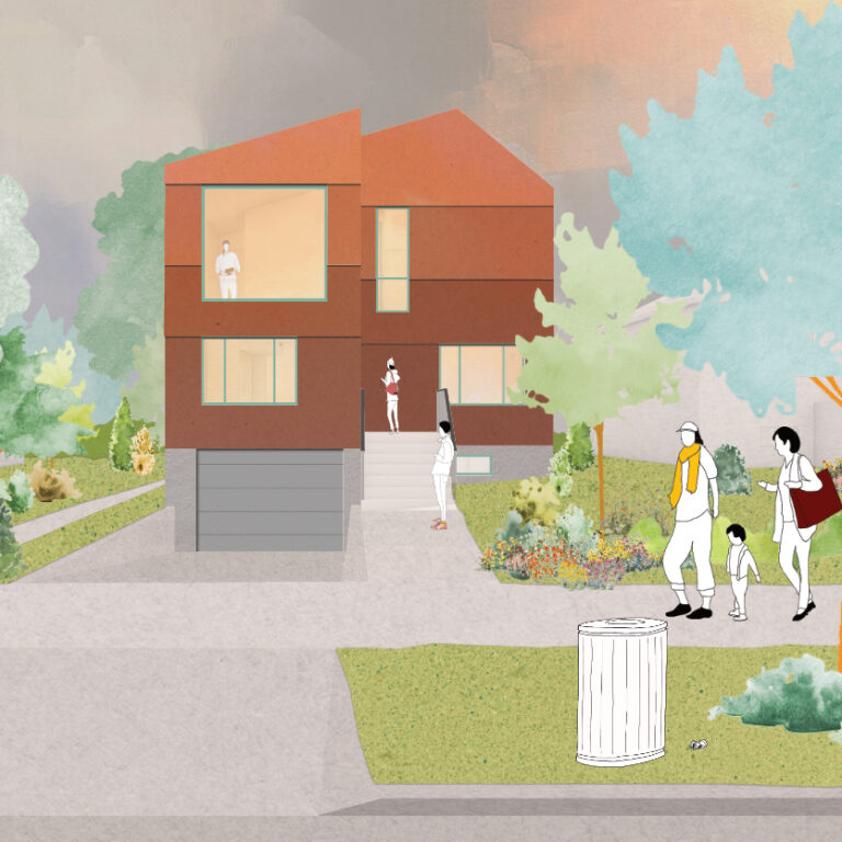 In this particular case, we apply the strategy through the use of four modules [entry/bath, living room, kitchen, and bedroom] deployed to form the Seattle Four Square. It is an accessible/visitable, single-story unit arranged in a compact square with a gabled roof. It draws inspirations from the American Foursquare, a style popularized in the 1890s to 1930s and often built on narrow lots with simple woodwork or from a mail-order catalog. Many examples can still be seen today in Seattle. The metal roofing and wood rain screen speak to our climate and the natural resources that surround us.